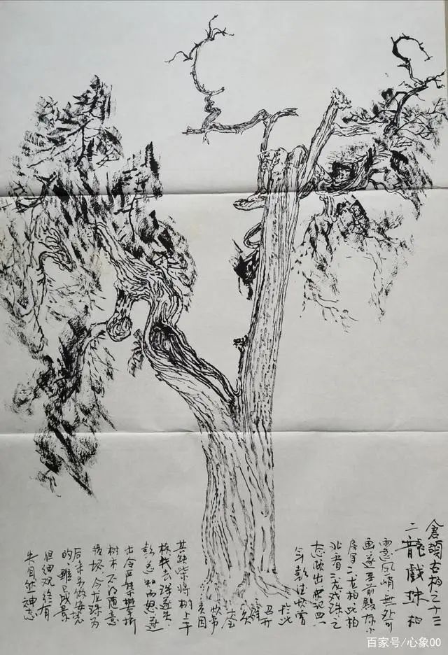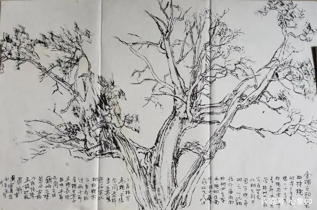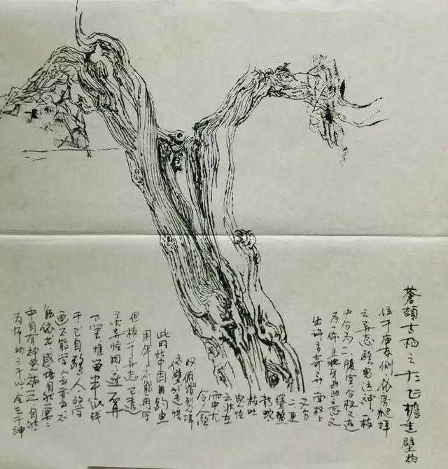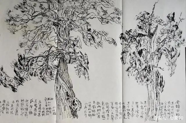 巡行一周,热汤已具,遂进食,取画夹笔墨,却不知从何处下笔,察看半晌,遂从西南喜鹊柏写起,其柏中裂,腹中空虚,奇耸斜立,柏枝垂钓,斜出一枝,干枯无叶奇态如喜鹊登枝,其尾高翘,似向青霄而长鸣。