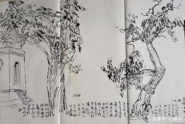 其日仅写六树。人生苦短,流光易逝,惜资质愚笨,四十八树,两日写不尽二十,自然神韵万不得一,忧思叩及幽蔼,寸目常寻灵踪,甚苦。晚写二树于册,宿于庙。