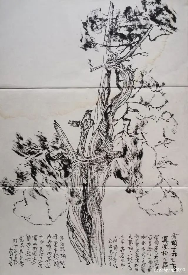 一夜雨丝未绝,至晨暂停,遂起洗漱。雨雾掩门,阴霾迷空,惟翠柏如滴,晨风轻雾如泣如诉,那仪态万方的迷韵,让人神魂欲绝。遂取纸笔直上窑顶,人与柏几欲平,凤凰柏凤头高昂,双翅凌空,昨日所不能见之势豁然开目,凤骨凤爪,左右上下盘护,势作腾挪欲飞之姿,自然如神更雨雾缭绕,轻岚迷离,风峭云低。只是手拙如爪,不禁欲哭,迷雾湿纸仅勾大概,雨滴又至,不得已下窑顶,于廊檐下再写点元仓颉柏大势。
